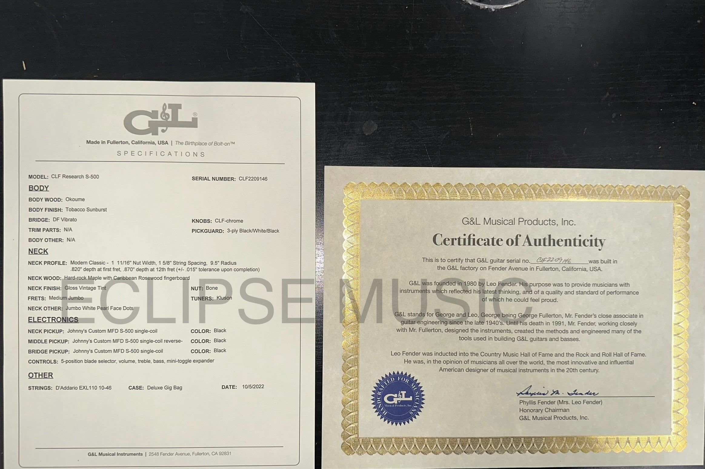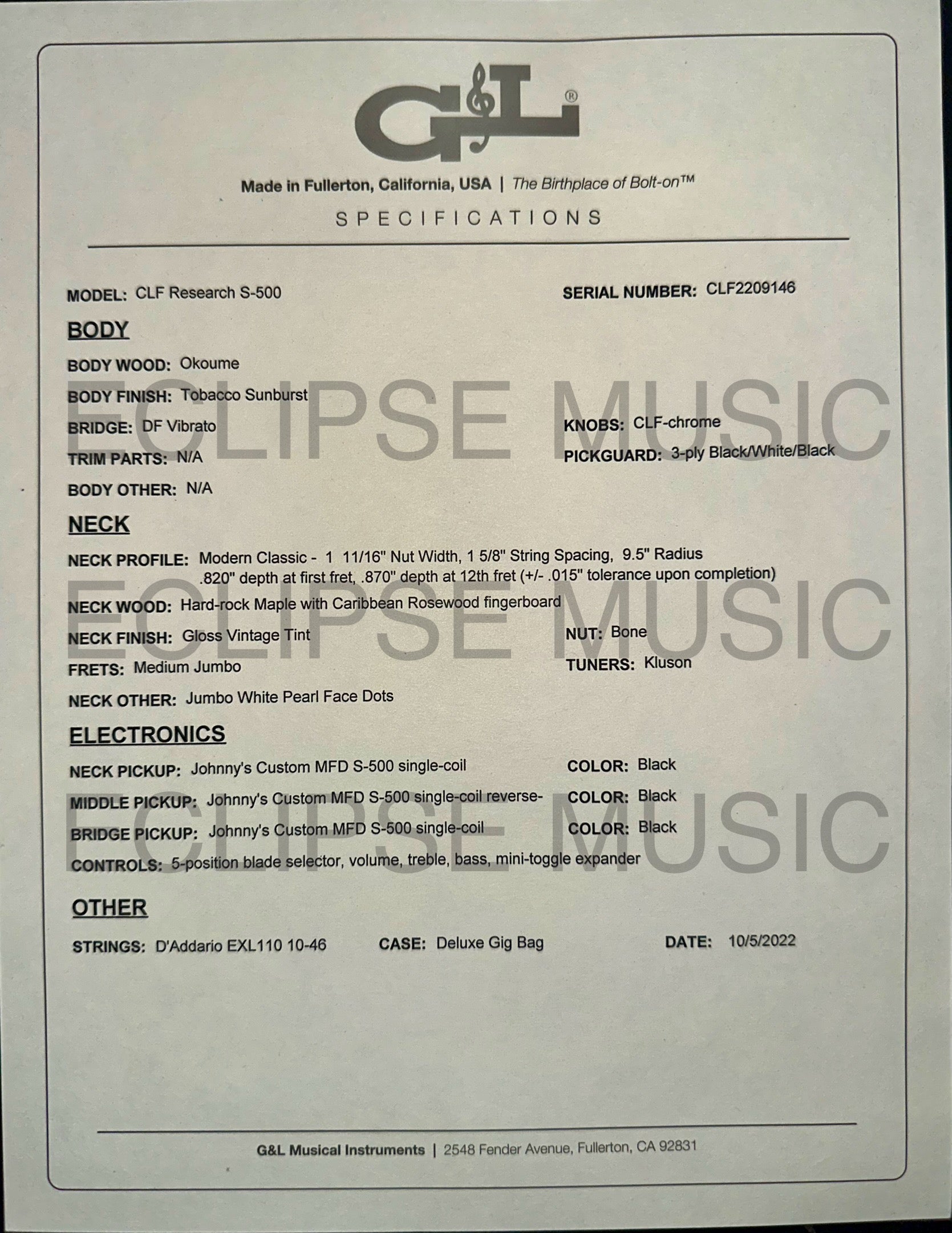 G&L USA CLF Research S-500 Tobacco Sunburst w/bag