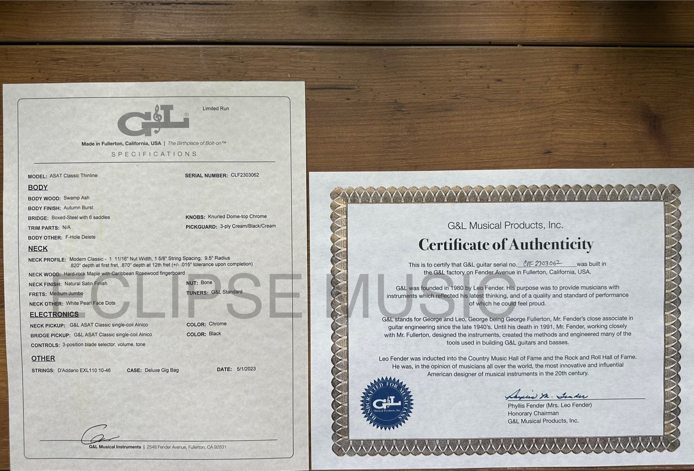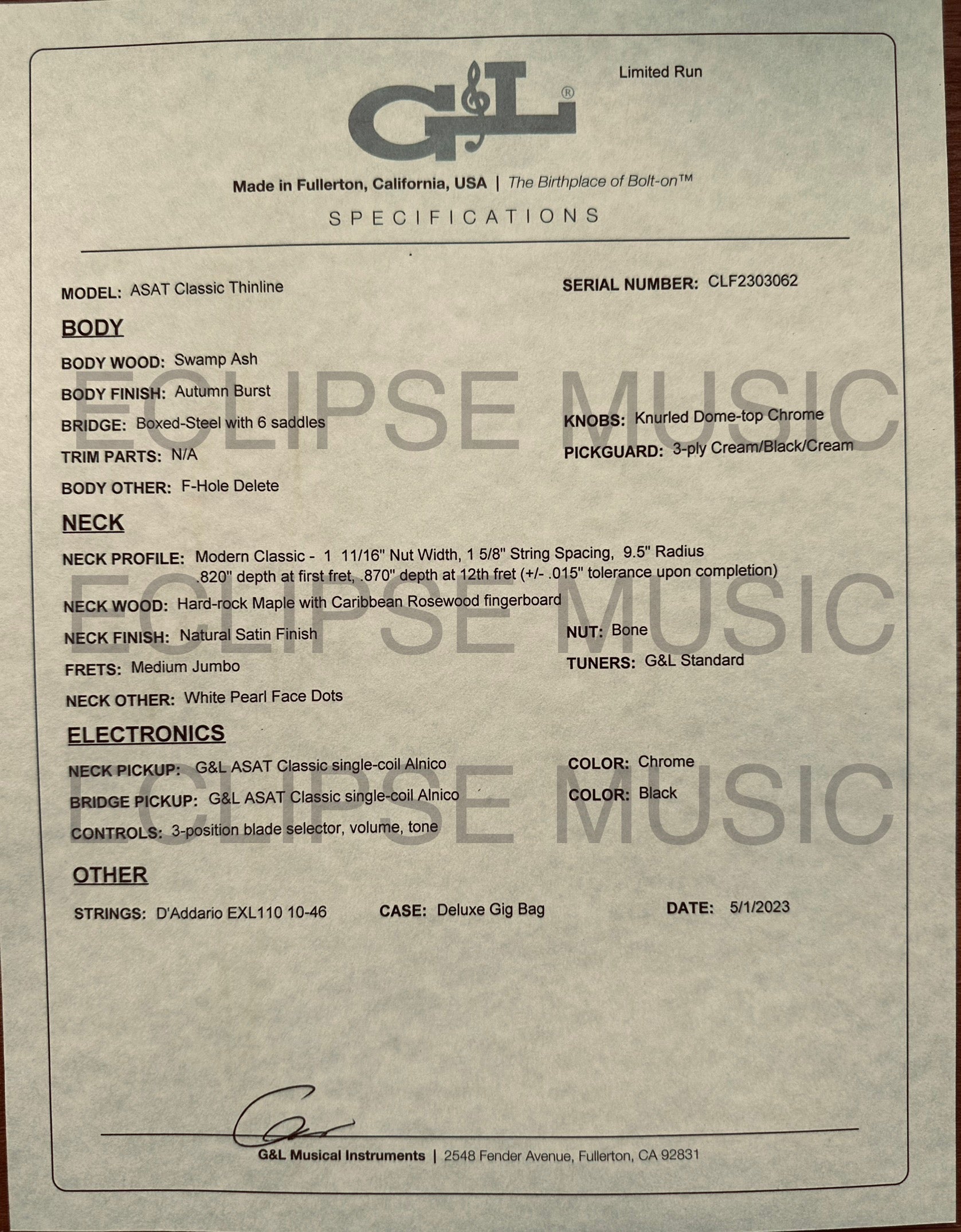 The G&L ASAT Classic Thinline Limited Run blends vintage Leo styling cues with modern Leo function and refinement. Featuring G&L alnico pickups, semi-hollow swamp ash body with the F-hole deleted for the appearance of a solid body and a Jet Black back, Modern Classic neck profile with 9 1/2" radius and Natural Satin neck finish. Only 25 in this gorgeous finish were made.