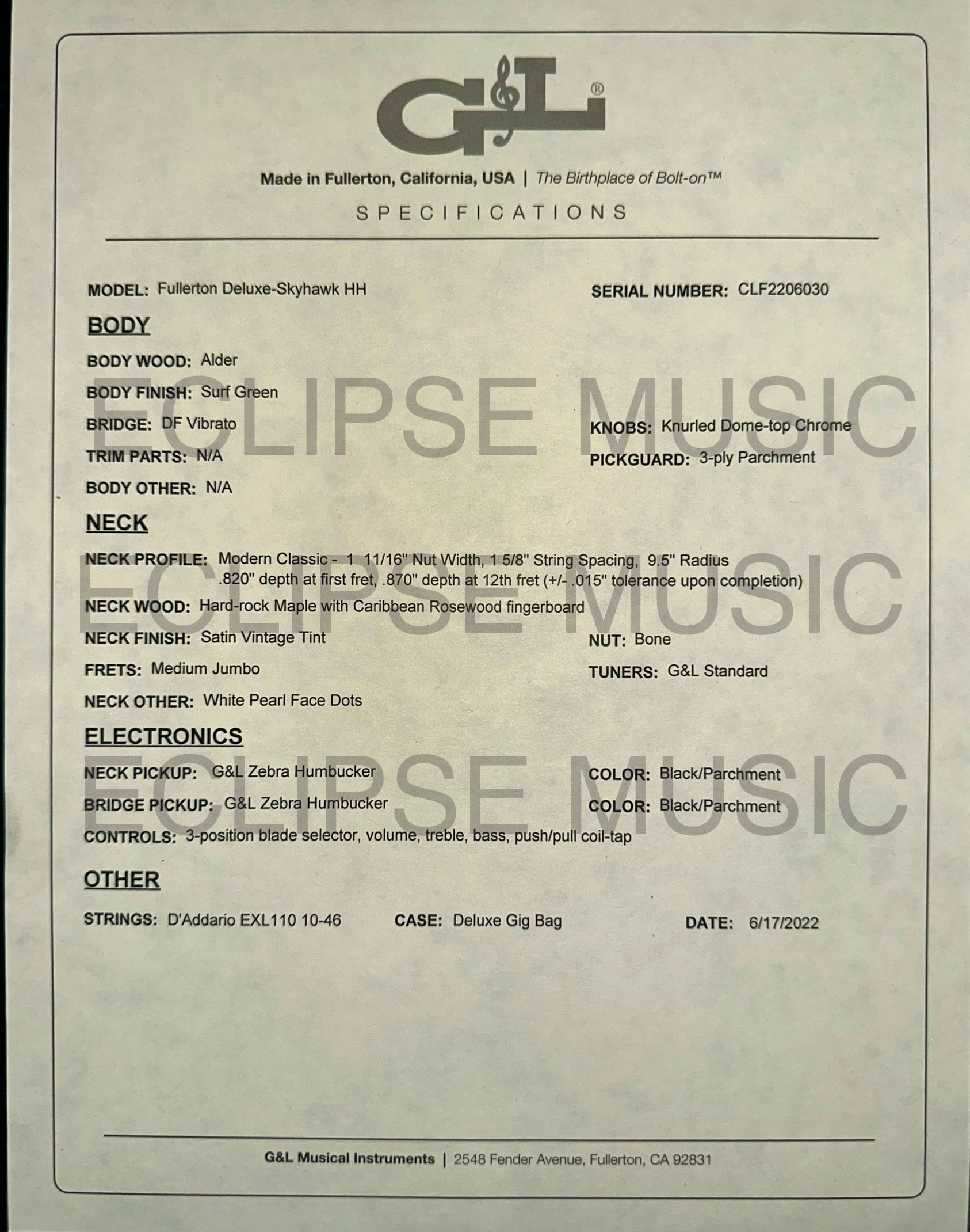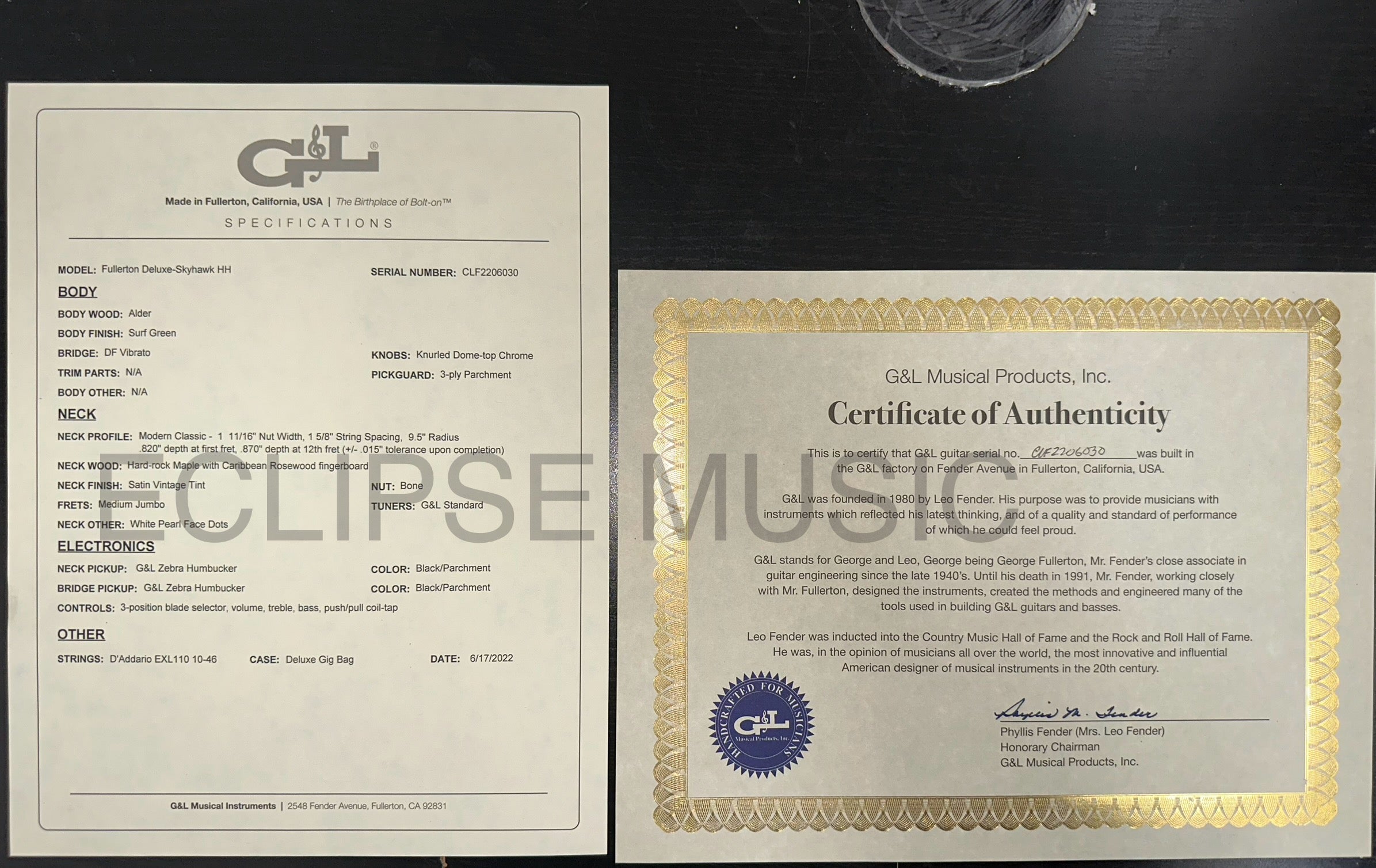 G&L USA Fullerton Deluxe Skyhawk HH Surf Green w/gig bag