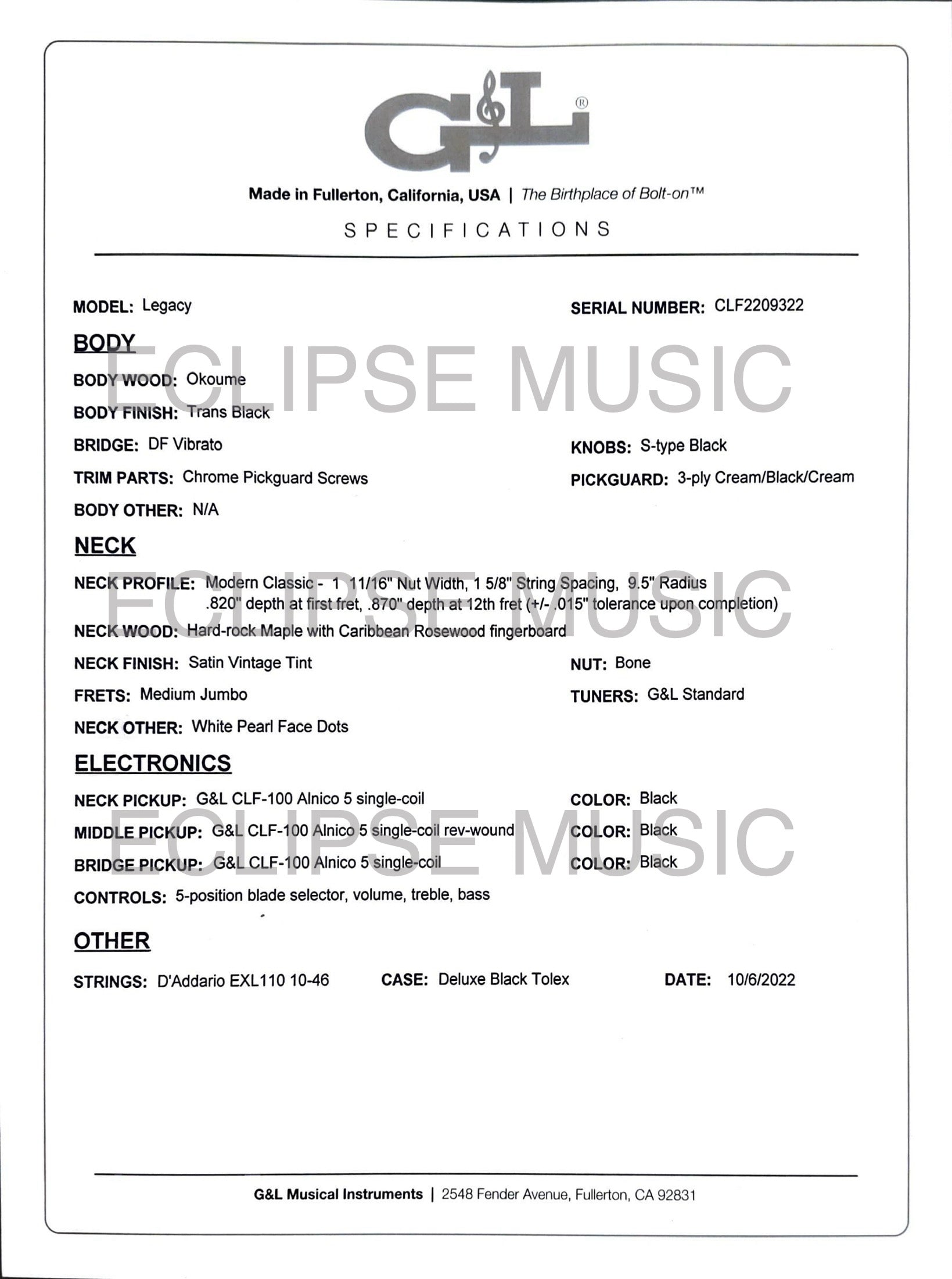 - INCLUDES: G&L Tolex Case