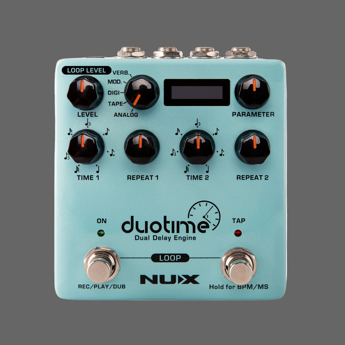 Tape Echo (55ms~552ms) is based on RE-201 Tape Echo algorithm with NUX Core Image Technology. Use the PARAMETER to tweak the Saturation, and feel the distorted sound decay. Just like the real tape echo machine, when you adjust LEVEL and REPEAT to maximum, try adjusting the time knob down to zero, and you have infinite feedback and pitch shift flange.